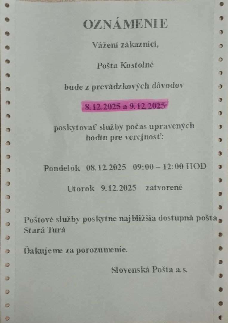 OZNAM: Pošta Kostolné