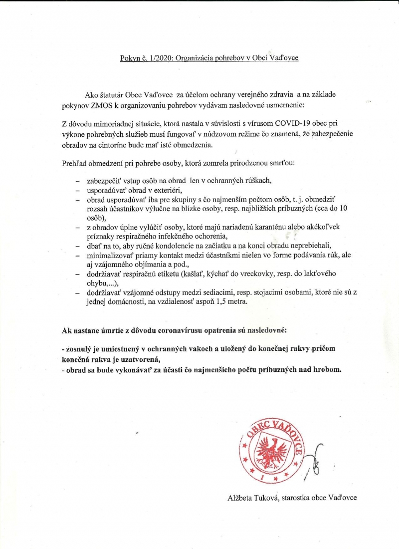 POKYN č.1/2020 starostky obce Vaďovce