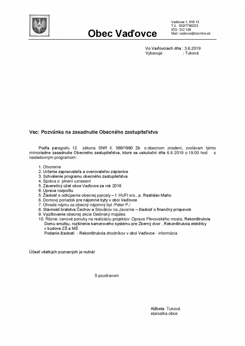 Pozvánka na zasadnutie Obecného zastupiteľstva