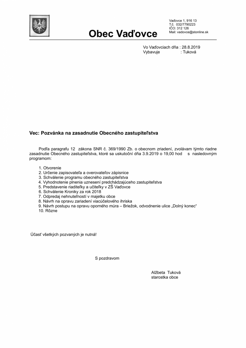 Pozvánka na zasadnutie Obecného zastupiteľstva