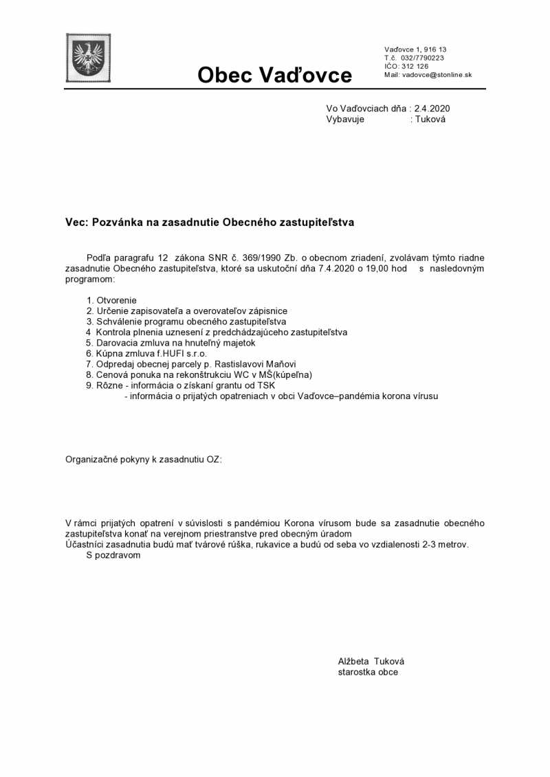 Pozvánka na zasadnutie Obecného zastupiteľstva dňa 07.04.2020